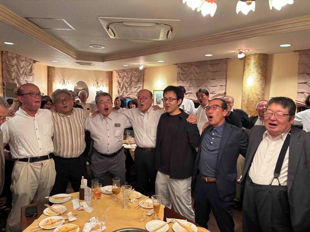合同勉強会のあとは、近くにあるお店を一軒貸し切り、総勢47名で立食形式で懇親会を行いました。両校の垣根がなくコミュニケーションを図り、親睦を深めることが出来ました。最後は、全員で肩を組んで若き血を2回、全員が腕を上げながら都の西北を3番まで熱唱しました。